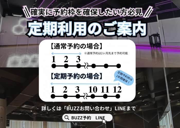 ご予約ありがとうございました。 ——————————————— ✨NEW OPEN✨  \\ BUZZ熊本 // 〜12/23 OPEN予定〜 ◆熊本市中央区上通町8−20 1階 ◆全5スタジオ :新デザイン導入のスタイリッシュな店舗 :1〜20人まで使える様々な部屋をご用意 ▶ ご予約はこちら https://buzz-st.com/kumamoto ———————————————— ========= スタジオ内Wi-Fi ID:BUZZ_hakata PASS:buzz88888 ========= ※スタジオご利用に関するお願い※ >>退出時は「必ず」ドアストッパーを下ろして ドアを解放し換気を行ってください。 ※結露・湿気が発生した場合は、共用部にあります扇風機や吸水モップをご利用ください。 音楽使用中に窓を開けての換気は禁止しております。マナーを守ったご利用をよろしくお願いいたします。 ゴミの持ち帰りと簡単な清掃を行ってください。 また、隣のスタジオに音が響きますのでオーディオをご利用の際には音量を上げすぎないようご注意ください。 皆様が気持ちよくご利用頂けるようご協力よろしくお願いいたします。 【注意】 ・土足禁止 室内履きをご持参ください。 ・置き引きにご注意ください。 スタジオを離れる際は貴重品を肌身離さずお持ちください。 お客様のご理解とご協力をお願いいたします。 ※スタジオ内での盗難等については責任を負いかねます。 【2000円クーポン当たる!】 アンケート回答で毎月20名様に 割引クーポン2000円分当たる? ▪️アンケートはこちら https://docs.google.com/forms/d/1gQDq-pdTlAyZpIXjJK9uKnXTiGdkVTgGg0Mkrt0Ga_w/edit?edit_requested=true