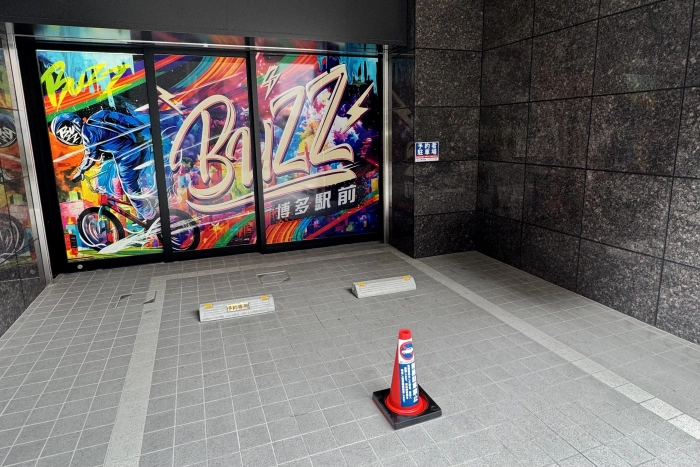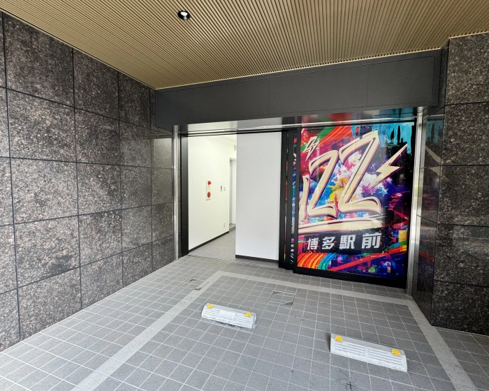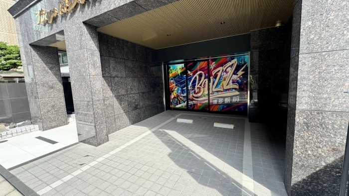 「BUZZ博多駅前」のラッピングがしてある自動ドアが入り口