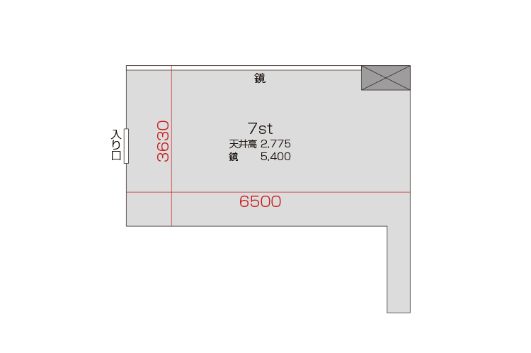 広さ 23.7㎡ 天井高 2.77m 鏡 5.4m