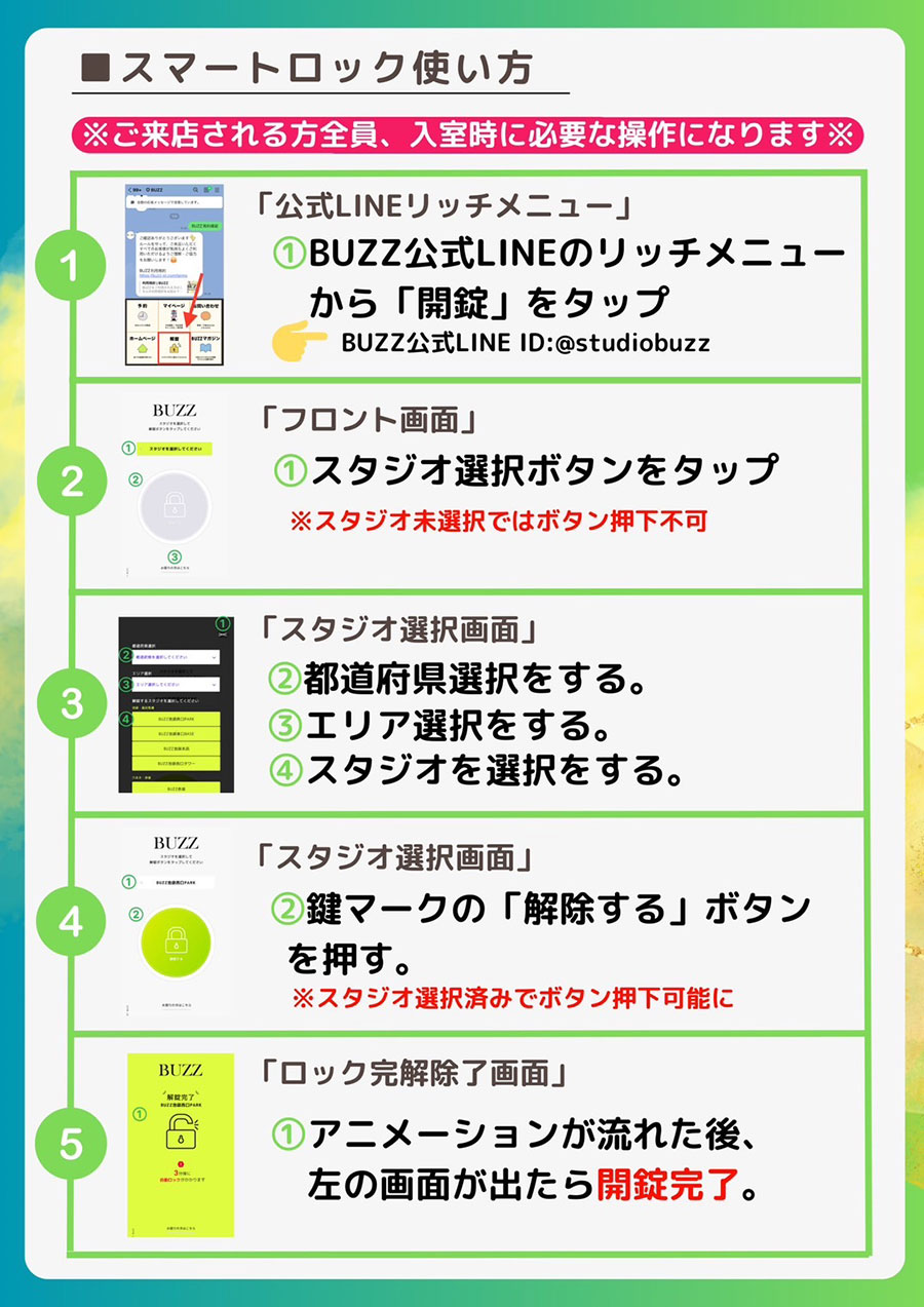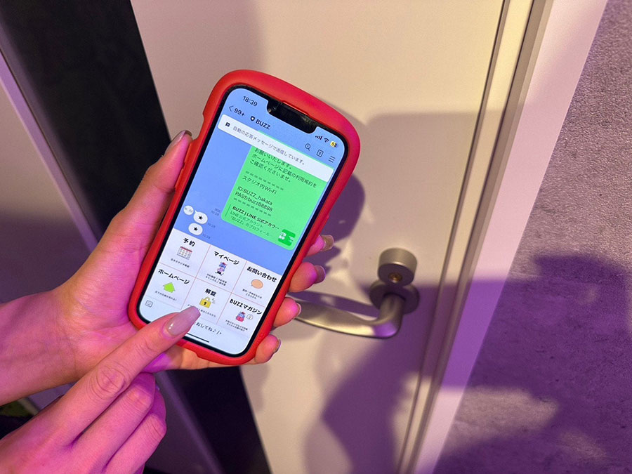 점포의 입구에는 스마트 락(열쇠)이 설치되어 있습니다. 점포 앞에서 BUZZ 공식 LINE에서 해정을 실시하십시오.