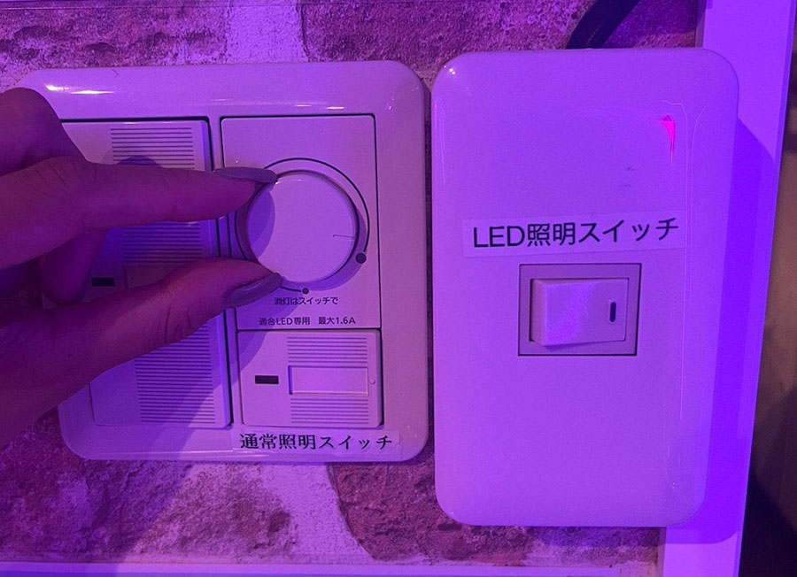 入口付近の照明スイッチとエアコンを点けてご利用ください。 通常照明:調光つまみの下にあるスイッチでON/OFFができます。