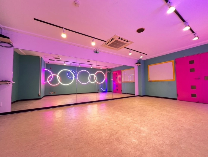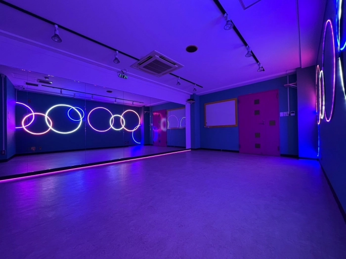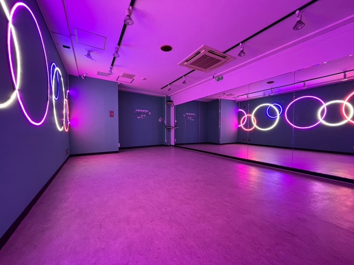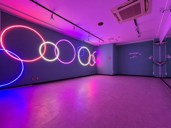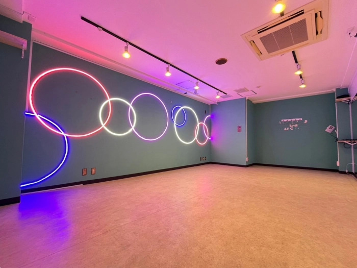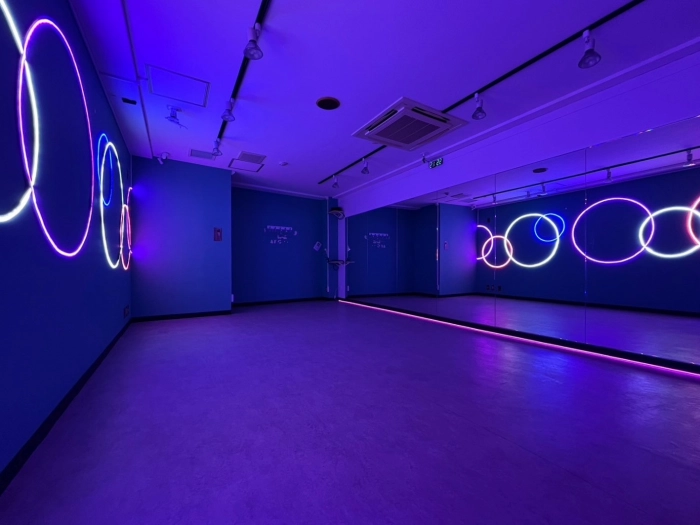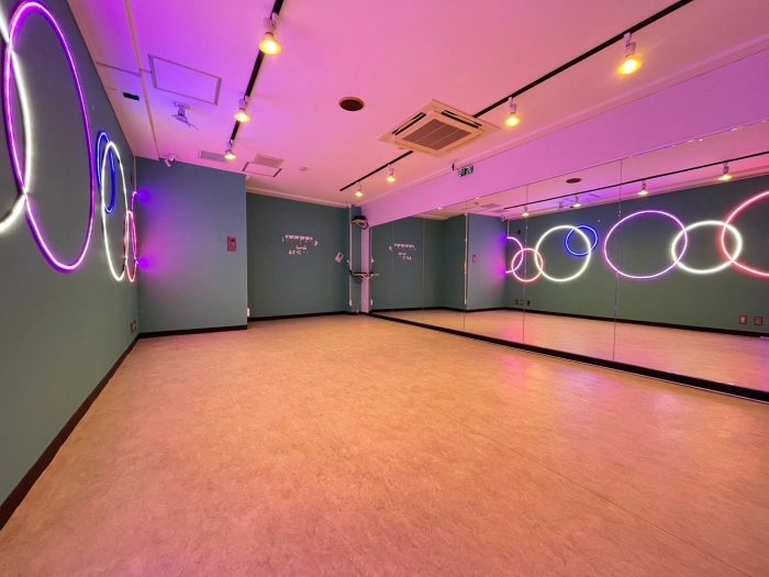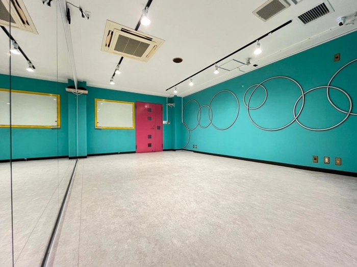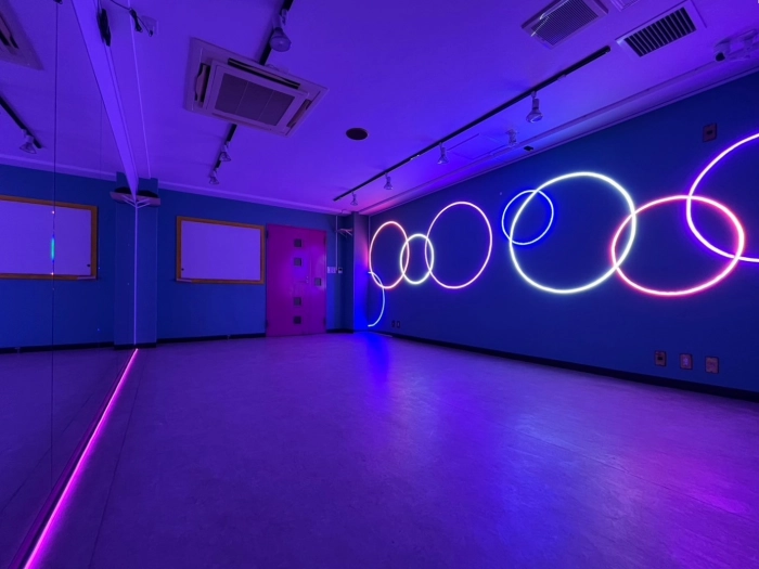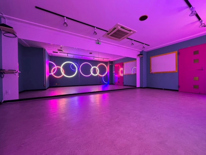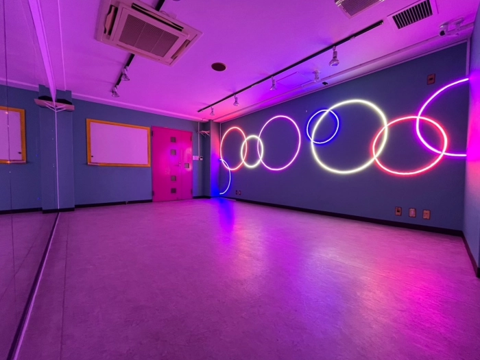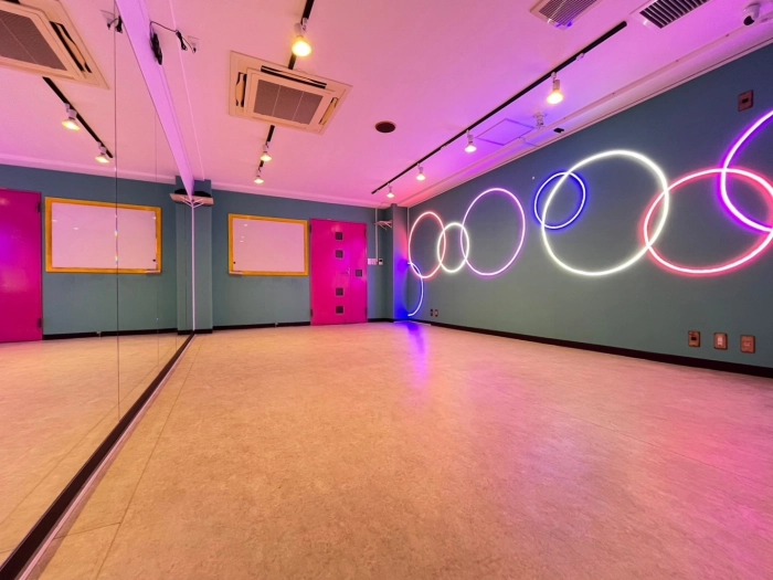 【海外の子供部屋風内装デザイン】 CUTEなカラー壁×カラフルLED あらたな「海外の子供部屋風POP」なデザインのスタジオが誕生! コンセプトに合わせたこだわりのダンス動画が撮影してみませんか? 明るい状態・LEDのみの状態、其々また違った雰囲気で楽しむことができます♪ 10~15名での利用可 レッスンにおすすめの中型スタジオで💚