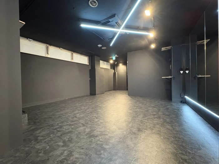 🖤黒を基調にしたクールな空間に、💡個性的なライティングと壁一面の大型ミラー