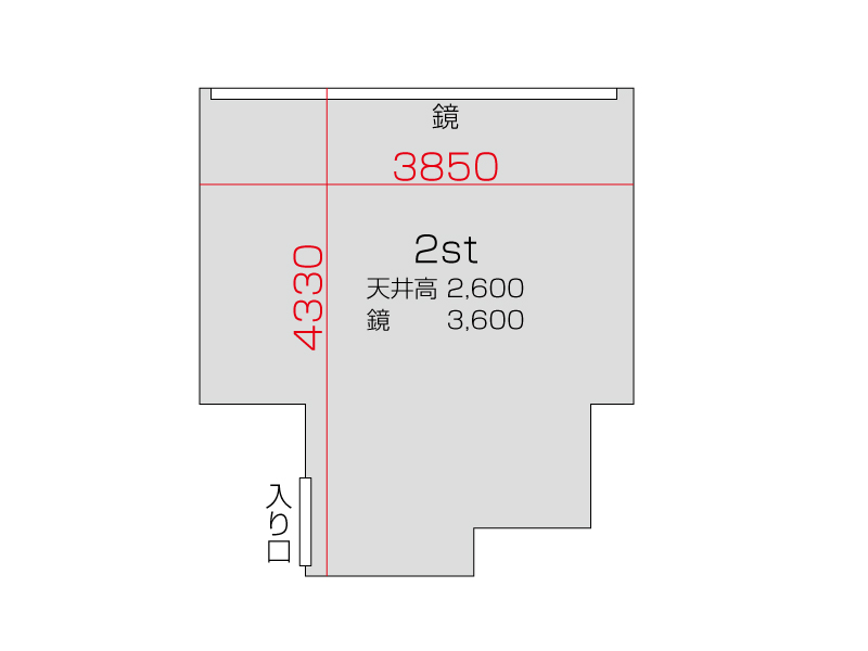 広さ 15.5㎡ 天井高 2.6m 鏡 3.6m