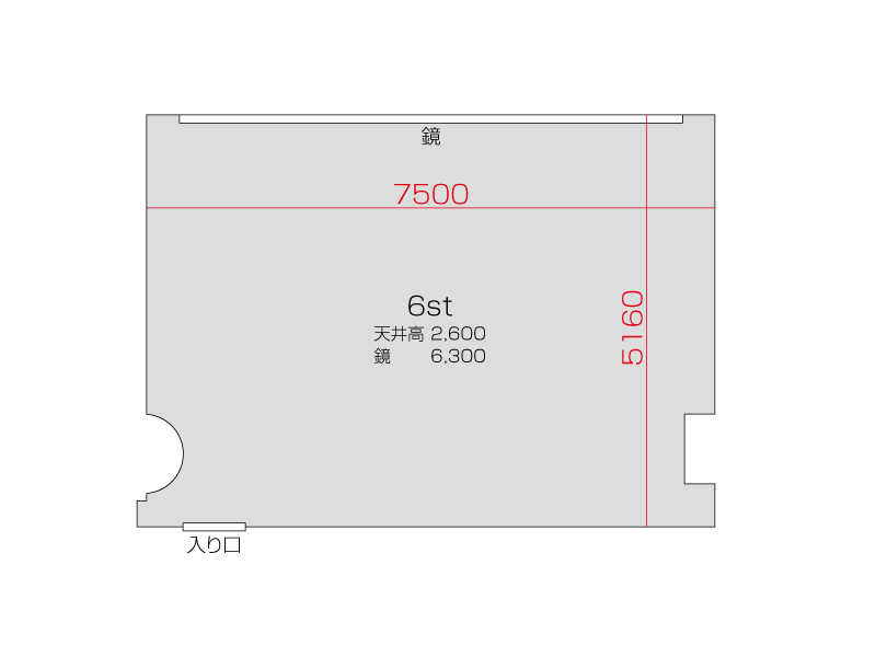 広さ 38.3㎡ 天井高 2.6m 鏡 6.3m