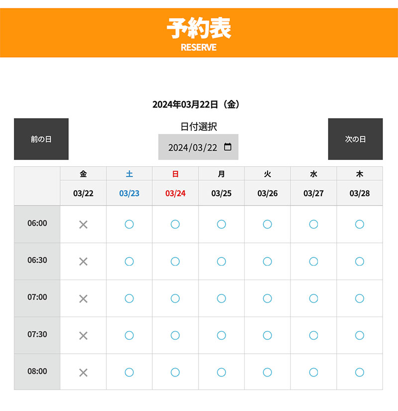 ② こちらの「予約表」から、空き情報を確認し、ご希望の日時を選択。