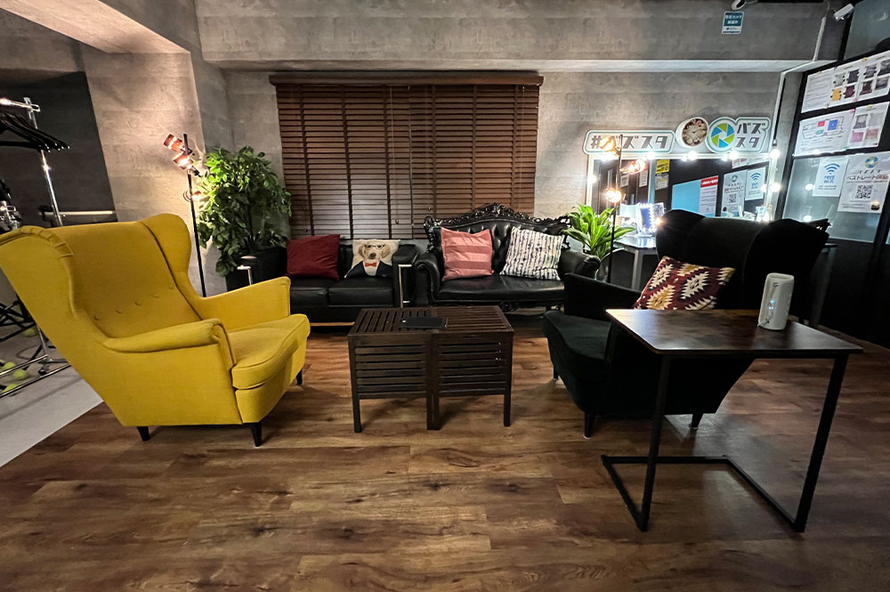 撮影の合間に、ゆっくりとくつろげるミーティングスペースを完備。ホワイトボードやソファは撮影のアイテムとしてもご自由にお使いください。