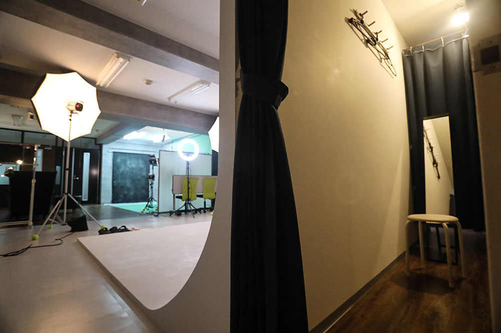 白ホリゾントの後ろ側が簡単な更衣スペースとなっております。室内ライトはスペース一番奥にございます。