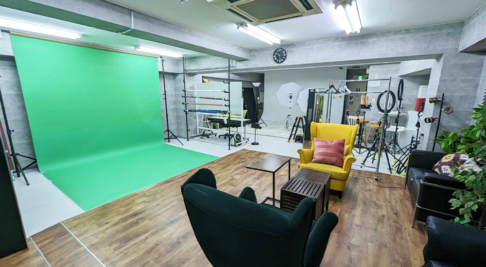 クロマキー処理が可能な背景となります。目安として3~5名様が横並びになっての撮影が可能です。前後2列になれば6~8様の集合撮影も画角に収まります。YouTube等の同録撮影にもご利用いただけます。
