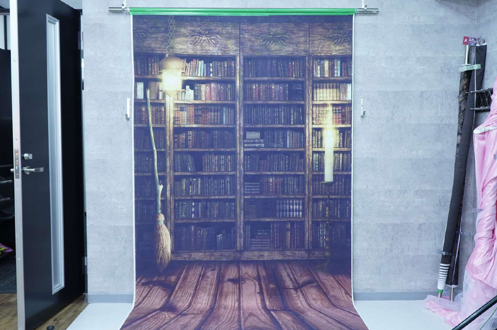 白ホリゾントの後ろ側が簡単な更衣スペースとなっております。室内ライトはスペース一番奥にございます。