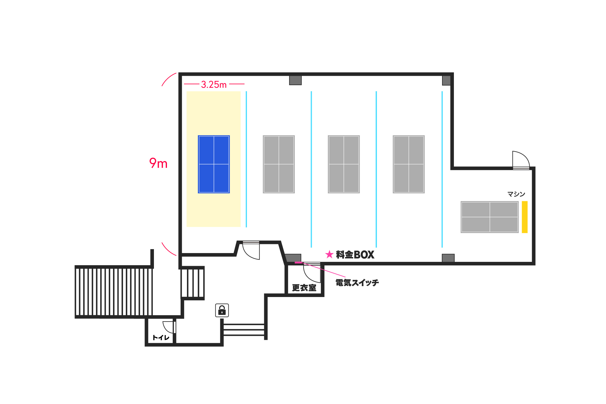 スタジオの入口前で靴を脱いでいただき、電気を点けてお使いください。受付での手続きなどは一切ございません。