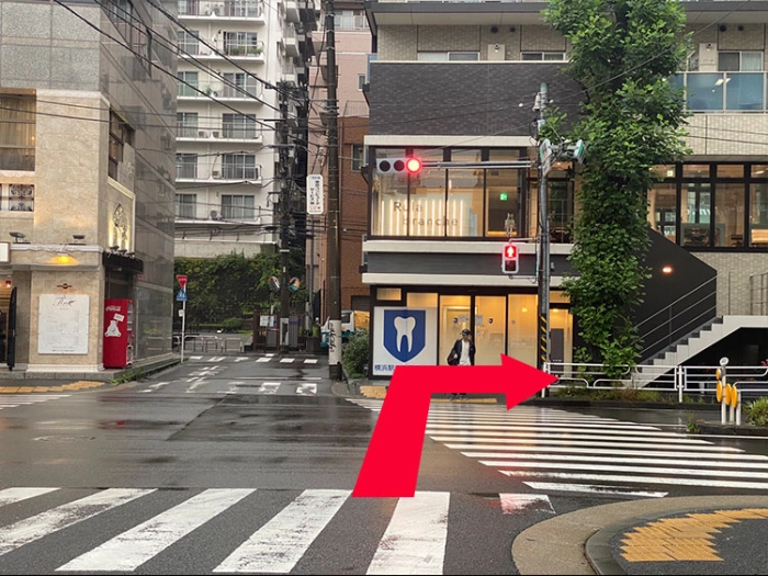 まっすぐ進むと信号が見えますので渡って右に曲がります。